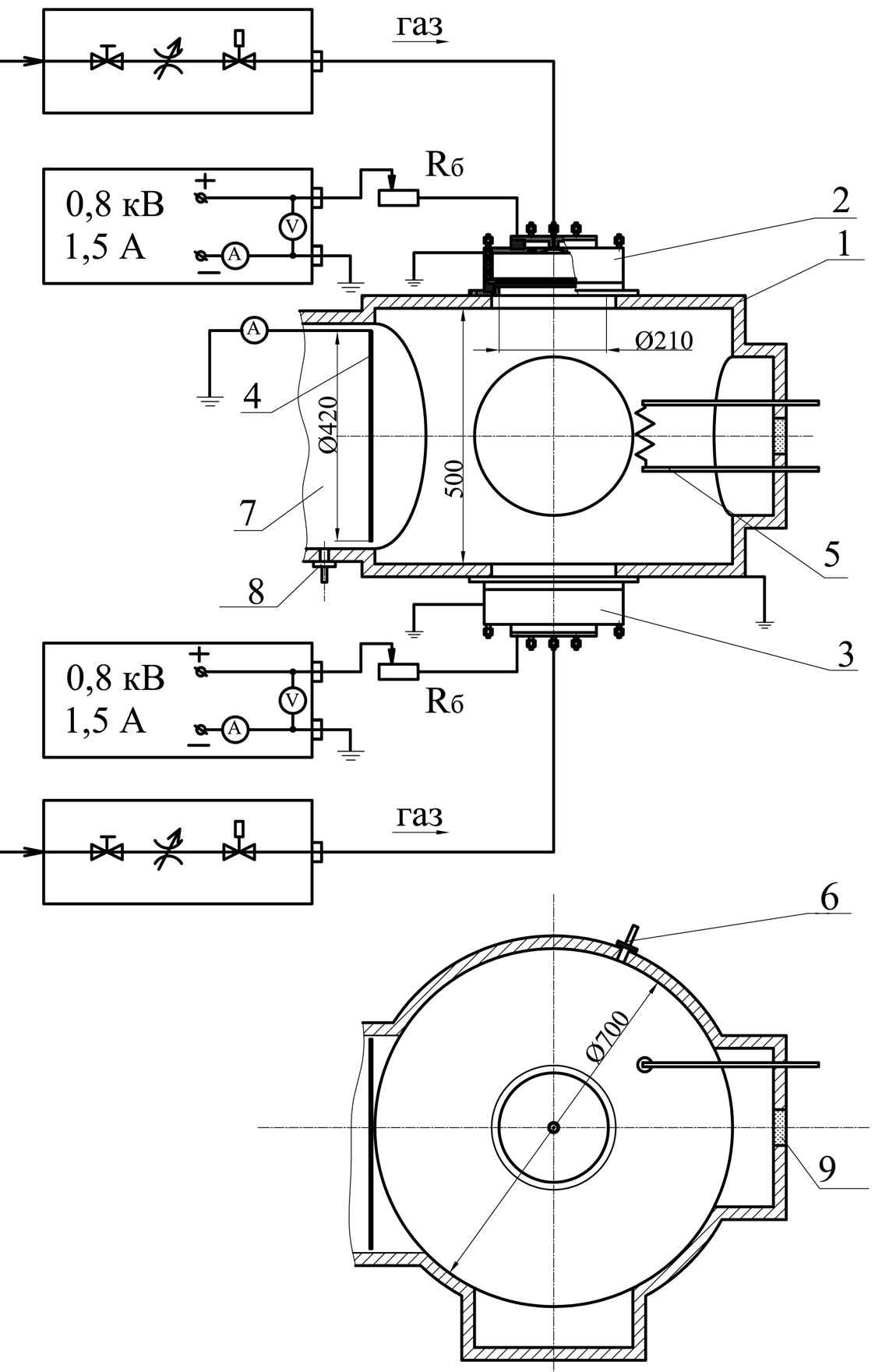 1 - полый катод (вакуумная камера установки УВН-75, Æ420 мм)