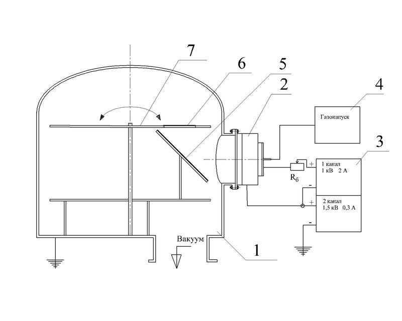 1. - Вакуумная камера, 2 - источник ионов с полым холодным катодом, 3 - двухканальный блок питания источника ионов, 4 - система газонапуска, 5 - мишень, 6 - образец напыляемый.