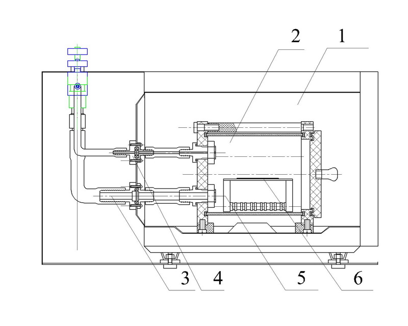 1. - СВЧ печь, генератор СВЧ плазмы, 2 - вакуумный реактор, 3 - система откачки формвакуума, 4 - система напуска газов (аргон, азот, кислород) , 5 - столик для образцов внутри реактора, 6 - образцы (пластины, пленкки на подложках, объемные детали)