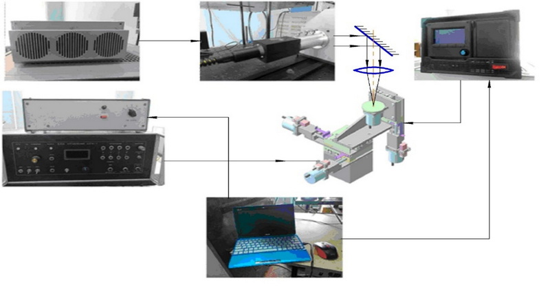 В состав установки входят: наносекундный импульсный волоконный 50 Вт лазер Raycus RFL-P50QB/A5/130/3 1, 2 - сканирующий гальванометр SG7210 3 , оптический блок F-thetaOPEX SL -1064-70-100G, предметный столик с подъемной осью 500 мм поZ5, контроллер ВJJCFIBER-M6 и персональный компъютер 7. Лазерный источник, использованный в этом исследовании, имел оптимальную длительность импульса порядка 200 нс по уровню 0,5 при частоте следования (30 -60)кГц и среднюю мощность (10 -50) Вт.. Рабочий диапазон сканирования гальванометра в этой системе составлял (65 х 65) мм, максимальная скорость сканирования 1500 мм/с. Объектив F-тета имел фокусное расстояние 100,0 мм. Контроллер 6 обеспечивал синхронизацию работы лазера и гальвнометра по осям Х, Y. Обрабатываемая подложка 8 располагалась на предметном столике 5.При обработке НРНТ-алмазов излучением лазера дополнительно в зону обработки вводится струя сжатого воздуха для отвода избыточноготепла от изделия и для удаления продуктов разрушения с последующей утилизацией при сохранении формы реза.