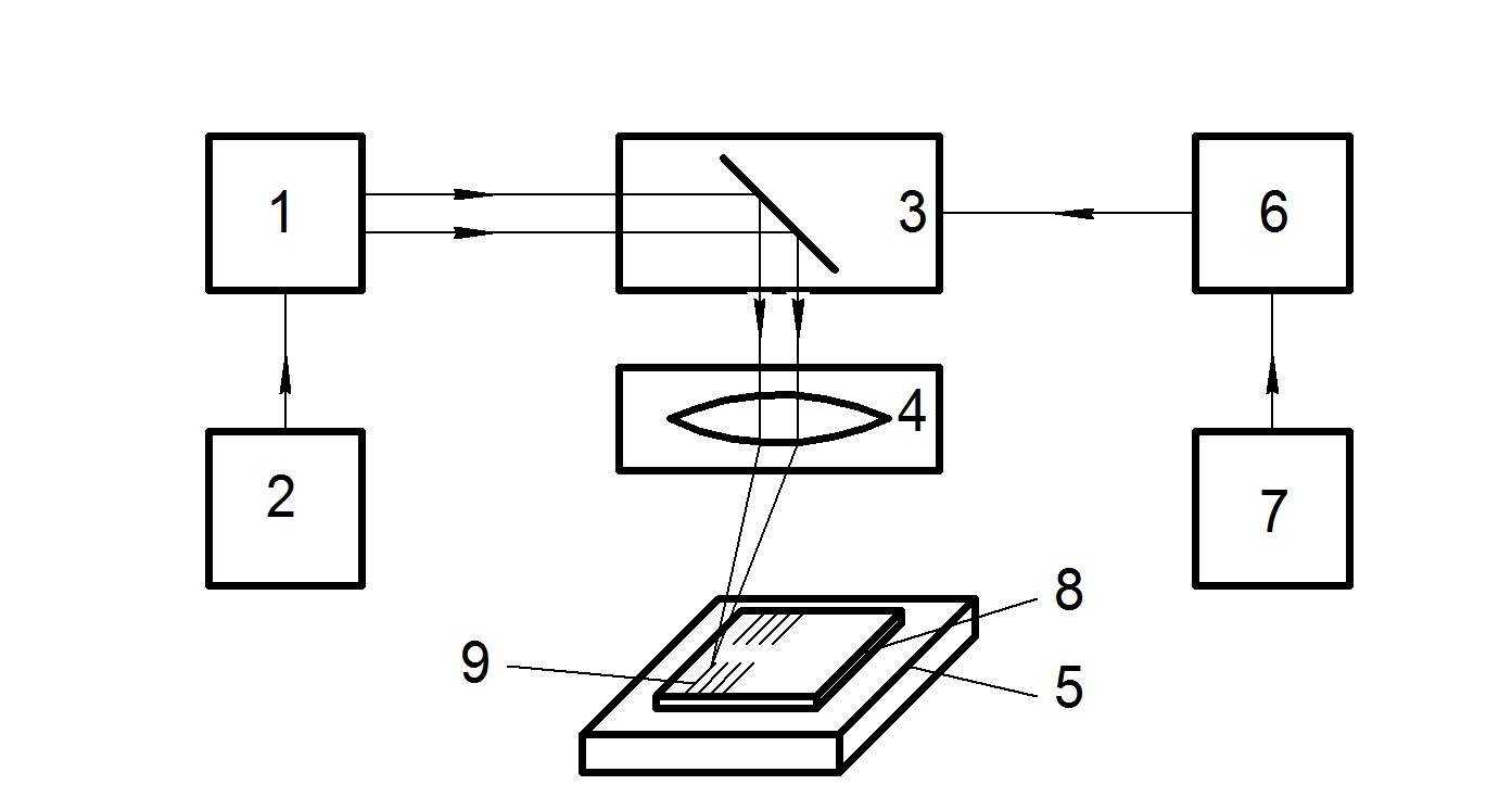 1 –лазер; 2 – блок питания и управления; 3 – сканирующий гальванометр; 4 - оптический блок; 5 – предметный столик; 6 –контроллер; 7 – персональный компъютер; 8 – подложка из НРНТ-алмаза; 9 – линия реза